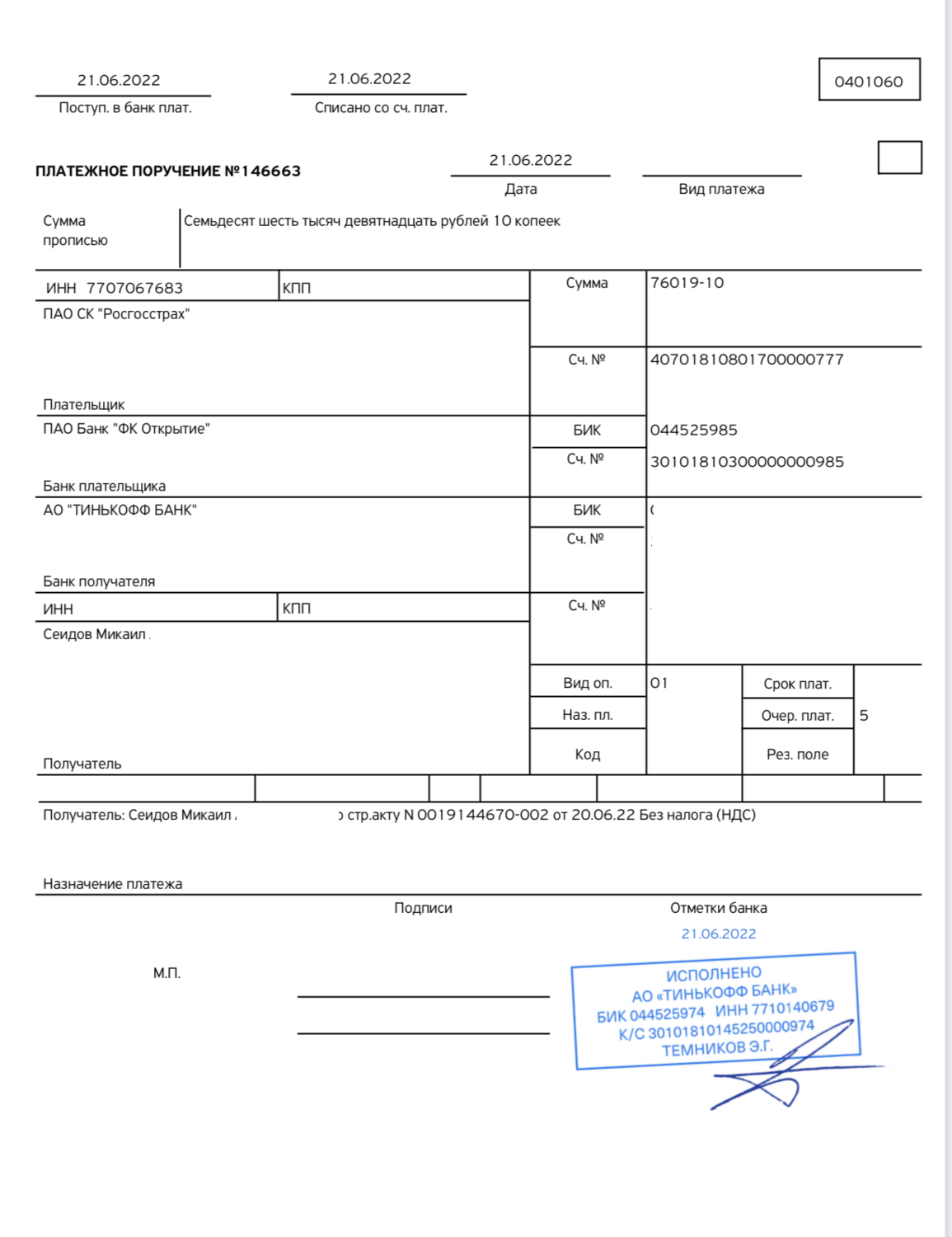 В досудебном порядке Клиенту выплачено недоплаченное страховое возмещение и УТС полученную в ДТП в размере 76 000 рублей