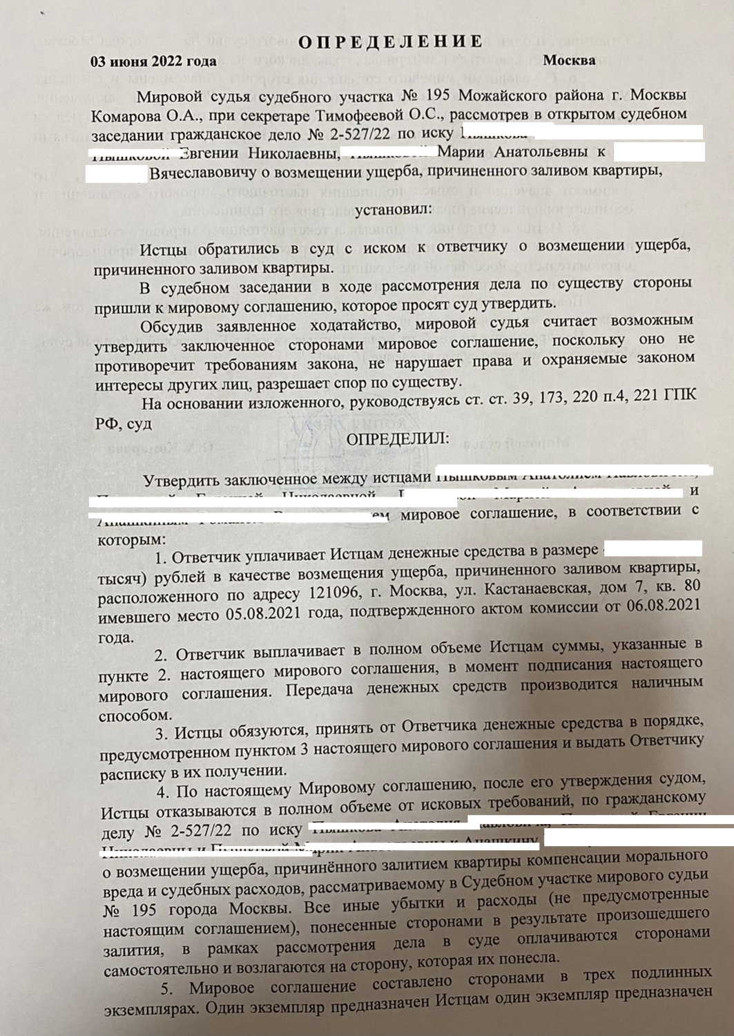 Посел долгих переговоров ответчик добровольно, в полном объеме компенсировал материальный и моральный ущерб и понесенные судебные расходы.