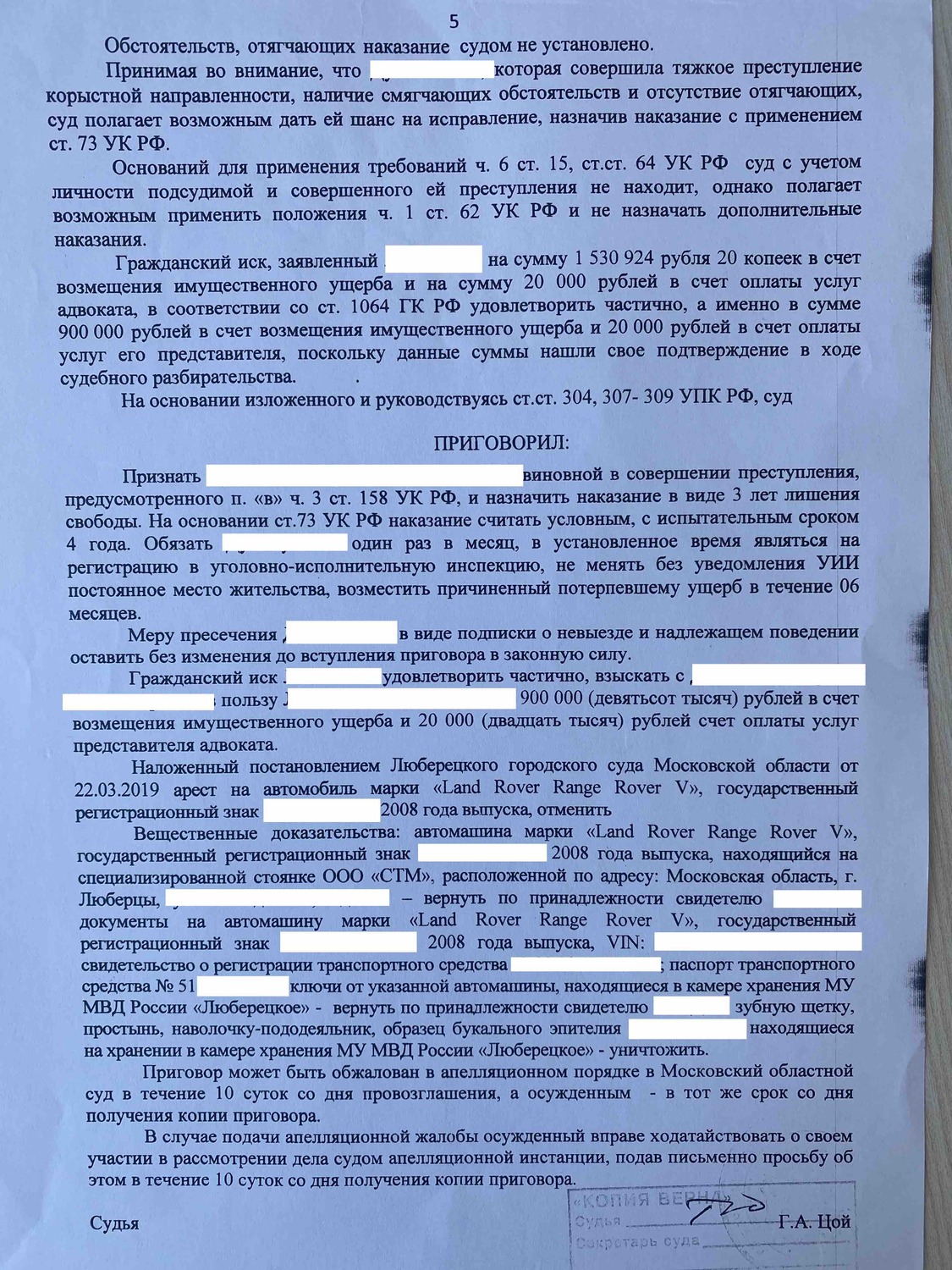 С виновника взыскано возмещение имущественного вреда в рамках уголовного дела в сумме 900 000 руб, а также понесенные расходы на представителя.